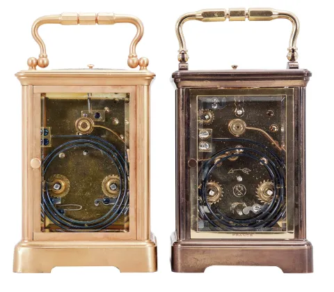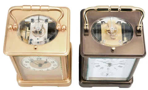 Carriage clocks- 2 (Two), both French, the first with glazed, gilt Corniche case marked "Tiffany & Co.", Arabic numeral white enamel dial with gilt mask and center, blued steel hands, two train movement with cylinder platform, striking the hours and half hour in passing, and repeating the last hour on demand, c1910, the other signed L'Epee, glazed Corniche case, polychrome enamel side panels, one with a young woman in a landscape, the other with nude female bathers, roman numeral white enamel dial, blued steel Breguet style hands, two train movement with lever platform, striking the hours and half hour in passing, and repeating the last hour on demand, c1980 L'Epee very good overall, running well, striking and repeating correctly, Tiffany regilded, dial with hairline, minute hand replaced and incorrectly oriented, ticks briefly, needs service, striking and repeating functioning correctly