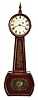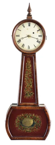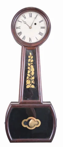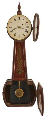 Clocks- 2 (Two) Massachusetts, unknown, 8 day, weight brass movement patent or banjo wall timepiece: (1) Attleboro style (2) Mahogany and mahogany veneered (1) cracked throat tablet (2) case in nice condition in an old finish has a small raised area at the hinge screws on the bottom door. The tablets are done on old glass, but not original. The throat tablet near the top is cracked and repaired. Original painted dial has loss at the mounting pins and surface stains. Original hands. Original well made movement. The pendulum rod is a piece of half-round brass riveted to the keystone and the pendulum support. The rod looks to be original although there are holes in the keystone and pendulum support for a threaded round iron rod. Measurements are of (2)