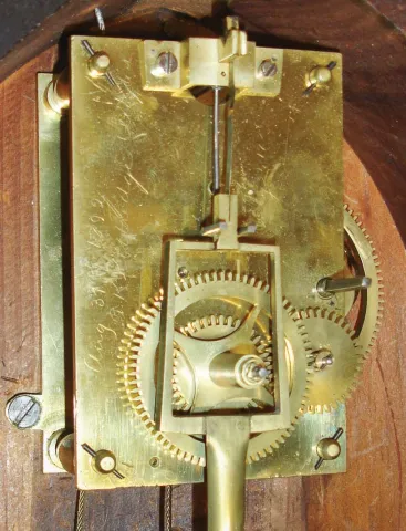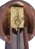 (1) cracked throat tablet (2) case in nice condition in an old finish has a small raised area at the hinge screws on the bottom door. The tablets are done on old glass, but not original. The throat tablet near the top is cracked and repaired. Original painted dial has loss at the mounting pins and surface stains. Original hands. Original well made movement. The pendulum rod is a piece of half-round brass riveted to the keystone and the pendulum support. The rod looks to be original although there are holes in the keystone and pendulum support for a threaded round iron rod. Measurements are of (2)
