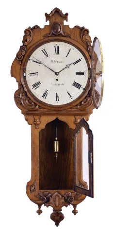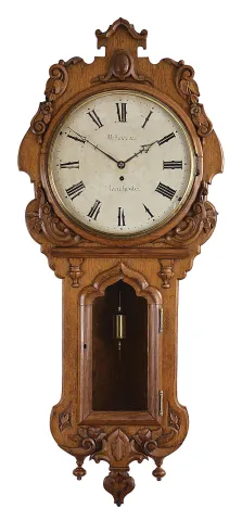 Refinished gothic style oak case in nice condition. Original painted dial is in reasonably good condition for its age with some wear to the chapter ring and some of the fine lines on the numbers. Original hands and pendulum