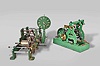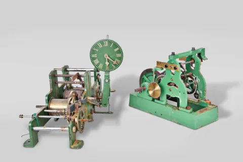 Tower or Street Clock Movements- 2 (Two) small with deadbeat escapement in green paint: (1) Time only; (2) Time and strike