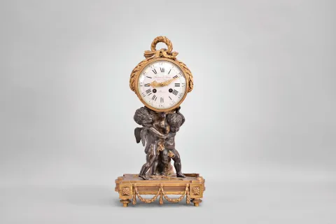 Cast bronze case has some remains of the original gilding. Original porcelain dial is perfect with original hands. Pendulum may be a replacement.