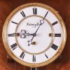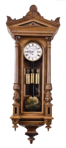 Ludwig Leeb, Horn, Germany, Vienna regulator wall clock, 8 day, time, strike and grande sonnerie with pull repeat, weight driven movement in a carved walnut Altdeutsch case with ebonized accents and white enamel dial the case retains an old finish with some deterioration to left support for seatboard. The crest has repair to lower left side. The molding above the bottom block on door has a hot glue repair. The pin for upper hinge on door is missing. The dial is in good condition.
