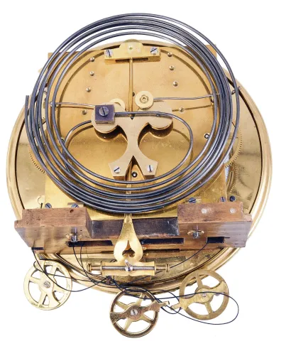 the case retains an old finish with some deterioration to left support for seatboard. The crest has repair to lower left side. The molding above the bottom block on door has a hot glue repair. The pin for upper hinge on door is missing. The dial is in good condition.