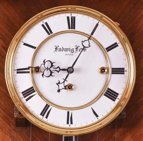 Ludwig Leeb, Horn, Germany, Vienna regulator wall clock, 8 day, time, strike and grande sonnerie with pull repeat, weight driven movement in a carved walnut Altdeutsch case with ebonized accents and white enamel dial