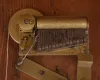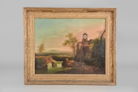 France, a large, 19th century musical picture clock, the canvas with rural landscape, foreground with rushing river, and shepherd with sheep, horses, and goats, all before a castle with clock tower, the background with village and distant mountains, the stretcher signed and with identification of view, contained within a deeply molded gilt frame with composition ornament, the two tune music box and 8 day, two train clock movement concealed behind the painting, musical selections are Yankee Doodle, and one other unidentified air, the clock movement with silk thread suspension signed "Robert a Paris" frame with minor damage to gesso, losses to gilding, and with gold paint touch up, painting with yellowed varnish and crazing, small tear in canvas, and with three areas patched and inpainted, clock dial misaligned with hole in canvas, movement tick and strikes, music box will play with encouragement, both movements would benefit from service, one hanger missing