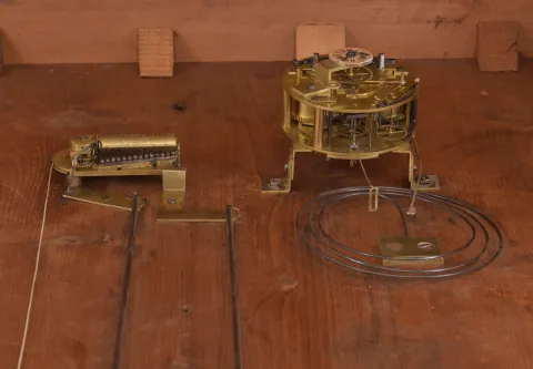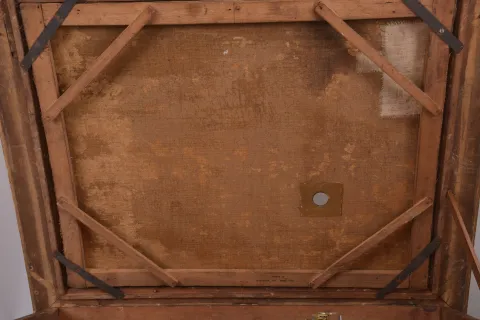 frame with minor damage to gesso, losses to gilding, and with gold paint touch up, painting with yellowed varnish and crazing, small tear in canvas, and with three areas patched and inpainted, clock dial misaligned with hole in canvas, movement tick and strikes, music box will play with encouragement, both movements would benefit from service, one hanger missing