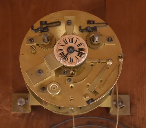 France, a large, 19th century musical picture clock, the canvas with rural landscape, foreground with rushing river, and shepherd with sheep, horses, and goats, all before a castle with clock tower, the background with village and distant mountains, the
