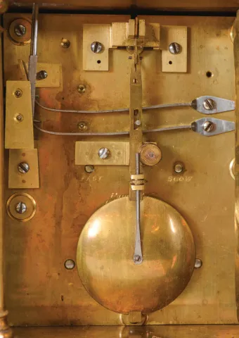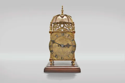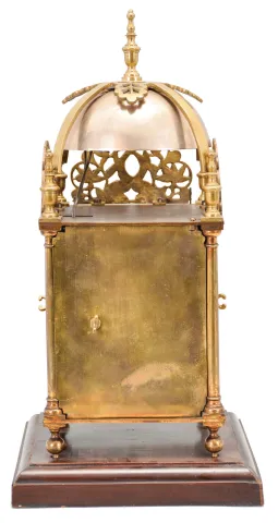 Payne & Co., 163 New Bond St, London, a Victorian, quarter chiming lantern clock, 8 day duration, with walnut base, brass case with turned finials, columns and feet, Roman numeral engraved brass dial with pierced steel hands, top with pierced frets, the front fret with engraving, cast brass bell strap suspending two large bells, the two train fusee movement with recoil escapement, striking ting tang quarters on two bells, and the hours on the smaller bell, back plate signed, serial #5054 case and dial with minor tarnish and discoloration, hands good, movement with minor tarnish and staining, running and striking correctly