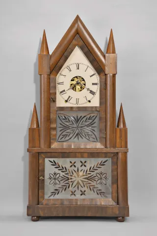Birge & Fuller, Bristol, Conn., 8 day, time and strike wagon spring brass movement steeple on frame or double steeple shelf clock. Mahogany and mahogany veneered case in an old finish has poorly replaced veneer on the front edge of the base that separates the top from bottom box. Veneer on the base sides is lifting. Bottom tablet is not original. Upper acid etched and cut glass tablet is original. Movement is signed. Label is missing. In spite of flaws, it is a nice looking wagon spring clock.
