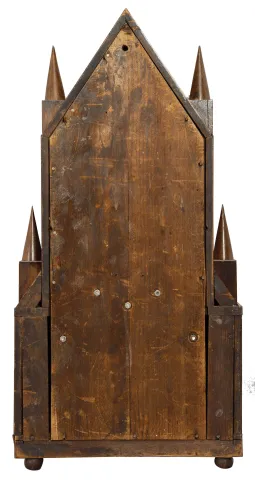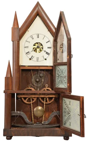 Birge & Fuller, Bristol, Conn., 8 day, time and strike wagon spring brass movement steeple on frame or double steeple shelf clock.