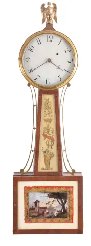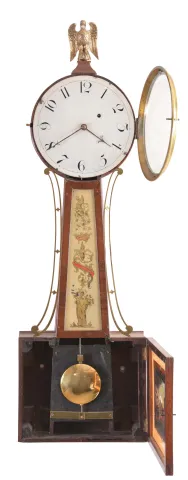 Massachusetts, likely Boston, early 8 day, weight driven brass movement patent or banjo timepiece. Mahogany and mahogany veneered case in an old and possibly original finish. The throat frame is attached to the case with four screws has some age cracks, small repairs on the top corners and small piece missing on the lower right corner. Bottom door has a small repair at the lower right corner. Throat tablet is old with gold paint used to repair gilding loss. Bottom tablet looks original with repairs to the background and center area. Original dial is fastened to the case with two L-turns and has been repainted. T-bridge movement. Period hands. One of the diamonds on the right side arm has broken off, but is included. Replaced eagle finial.