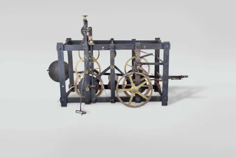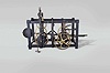 Tower clock, birdcage model of the late 18th century, time and strike, weight driven movement with pinwheel escapement in a cast iron frame