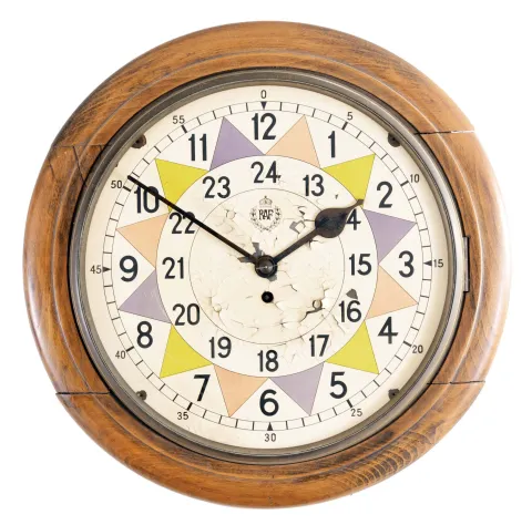F.W. Elliot, England, "Royal Air Force Operations Room Plotting Clock" or sector/radio room style clock, 8 day, time only, spring-driven, fusee movement in a beech case with polychrome painted metal dial that was used in conjunction with observations and radar to track and intercept enemy aircraft during the World War II. The movement and case are genuine Elliott, but this is NOT a true war time RAF timepiece. Rather, it was assembled from various Elliott parts and a dial painted to make it look like a RAF clock. The beech case has lost most of its finish. Painted metal dial is flaking and needs to be stabilized, but the RAF logo and outer ring used to color-code 5 minute intervals is still in good shape. The fusee has a chain and ticks when the crutch is moved manually. Pendulum is absent. One wooden peg is also missing. Signed movement is dated 1942.