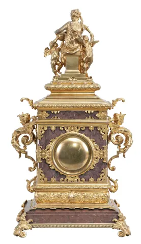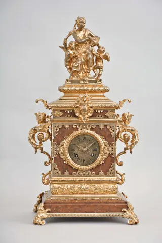Red marble and brass ornaments in very fine condition has a couple minor chips on the marble base. Brass dial is very nice and may have been originally silvered. Original hands. Movement is signed.