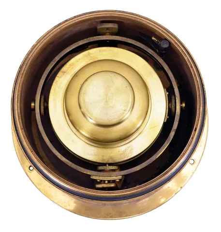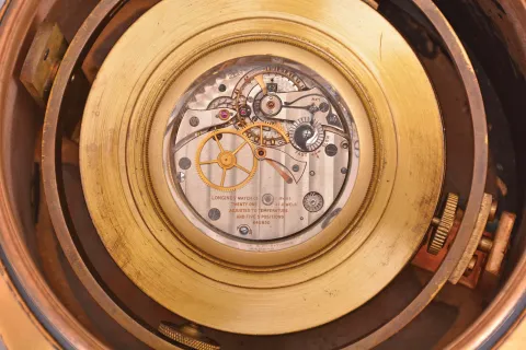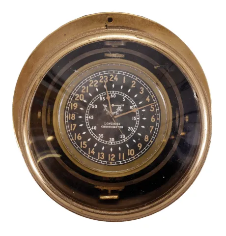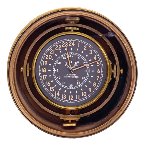 Longines, Switzerland, a bronze cased, one day lever chronometer with center seconds and wind indicator, 21 jewels, stem wind and set, adjusted to 5 positions and temperature, cotes de Geneve decorated nickel plate movement with lever escapement, monometallic balance and Wilmot micrometric regulator in a weighted, gimbal mounted brass case, with Arabic numeral, black painted 24 hour dial and luminous hands, all contained in a purpose made cylindrical bronze case with screw bezel and mounting flange outer case dirty, with minor marks and scratches, plastic crystal with scratches and chip, inner case with old lacquer, with minor scratches and tarnish, dial and hands very good, movement with minor marks and scratches, one case screw missing, the other with broken head, running, setting functional