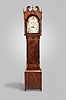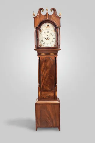 Unsigned New York or New Jersey, tall clock, 8 day, time and strike, weight driven movement in a inlaid mahogany case with high broken arch pediment top on hood with pressed brass rosettes and three brass finials. The painted metal dial is flanked by tapering full reeded columns with brass capitals up front and reeded quarter columns in the rear. The trunk has a crotch mahogany door flanked by similar full reeded columns over a crotch mahogany base framed by contrasting mahogany veneer resting on straight bracket feet. the case retains its original nicely rubbed down finish. There is an age split on the lower left side and minor veneer chipping on right side of base. There is a 3" wide section of the lower back board replaced. The dial retains its original paint with some fading to decoration and numerals. The consignor reports the clock is likely from the Elizabeth, New Jersey area.