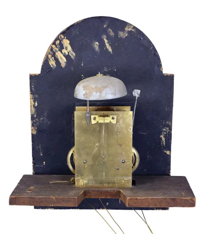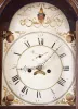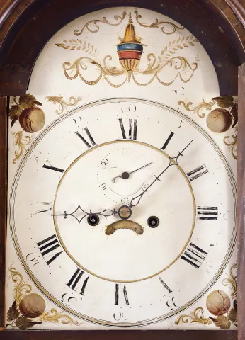 the case retains its original nicely rubbed down finish. There is an age split on the lower left side and minor veneer chipping on right side of base. There is a 3" wide section of the lower back board replaced. The dial retains its original paint with some fading to decoration and numerals. The consignor reports the clock is likely from the Elizabeth, New Jersey area.