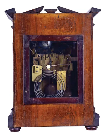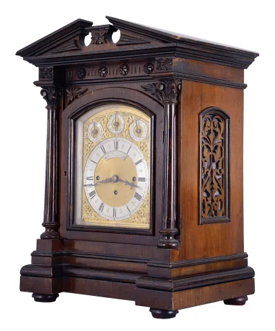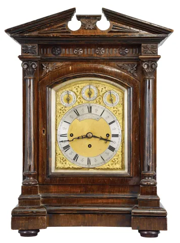 England, a monumental, quarter chiming table or bracket clock, the rosewood veneered and grain painted architectural case with molded base supporting a pair of columns with carved capitals below the carved entablature and broken pediment top, the sides