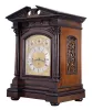 England, a monumental, quarter chiming table or bracket clock, the rosewood veneered and grain painted architectural case with molded base supporting a pair of columns with carved capitals below the carved entablature and broken pediment top, the sides with pierced, textile backed fret, composite dial with silvered roman numeral chapter ring, and subsidiary chime control and regulation at top, the dial also bearing an engraved plaque "The Association of Diamond Merchants, Jewellers, and Silversmiths, 6, Grand Hotel Buildings, Trafalgar Square, London", three train fusee movement chiming on eight bells or four gongs, and striking the hours on a larger, fifth gong case with worm holes, minor scrapes, bumps and dings, minor veneer losses, right side of frieze with opaque coating, left side fret with repair, front door lock broken, door edge with minor marring from screwdriver, hinges loose, dial with minor tarnish and loss to gilding, hands with minor oxide, movement dirty, steel components with patchy rust, movement dirty, will tick, strike, and chime with encouragement, suspension spring broken, gong hammer damper detached, needs service.