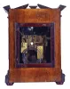 case with worm holes, minor scrapes, bumps and dings, minor veneer losses, right side of frieze with opaque coating, left side fret with repair, front door lock broken, door edge with minor marring from screwdriver, hinges loose, dial with minor tarnish and loss to gilding, hands with minor oxide, movement dirty, steel components with patchy rust, movement dirty, will tick, strike, and chime with encouragement, suspension spring broken, gong hammer damper detached, needs service.