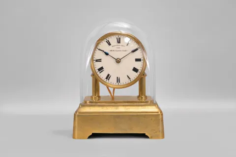 Heavy cast brass base. Original porcelain dial has a small hairline crack at 11 o'clock. Original hands. An example of this model with a dial mounted above the balance wheel can be found on page 15 of "The Eureka Clock" by F. G. Alan Shenton.