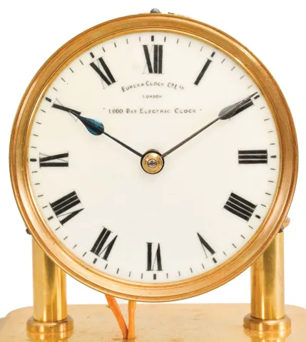 Eureka Clock Co., London, battery powered mantel clock with oversized balance wheel movement on a brass base and a cream color porcelain dial, s#2550