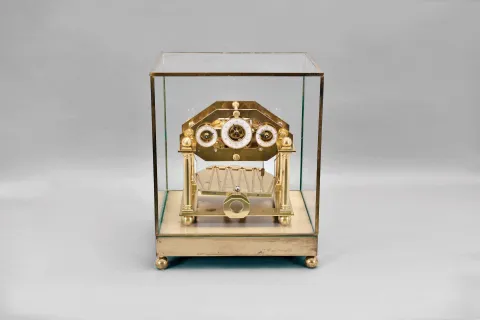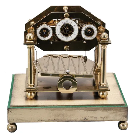 Emperor Clock Co. Ltd., London, a reproduction Congreve rolling ball timepiece, fusee movement with separate dials for minutes, hours and seconds, the plates supported by four turned columns, all resting on ball feet, the tray with zig zag path for the steel ball "oscillator" suspended below the movement, and with rectangular base, spherical leveling feet, and conforming glass dome, serial #053 from an edition of 250. brass components with peeling lacquer, scratches, staining, and spotting, some steel with minor oxide, running, dome dirty