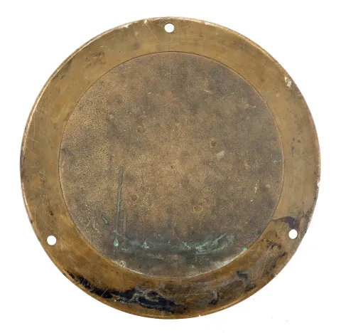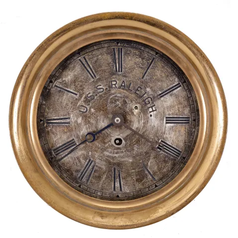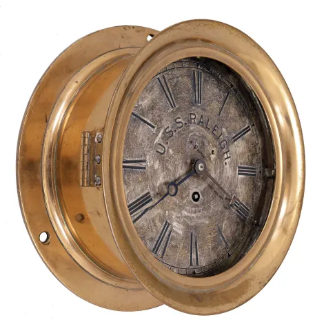 The U.S.S. Raleigh of this clock's era was a United States Navy cruiser commissioned in 1894 and in service until 1919. She served in both the Spanish-American War and World War I. Raleigh is credited with firing the first shot of the Battle of Manila Bay in the Spanish-American War. She was filmed with an early motion picture camera by Thomas Edison's company in 1899: The heavy brass case is stamped "ER" at the top, perhaps for "Engine Room". The case is tarnished and has some scratches. The bezel glass is missing. Key for locking bezel is present and working. The silvered dial is very tarnished with some yellow areas -- either brass or bad lacquer. Minute hand has surface rust. The rate adjustment hole in the dial was plugged and moved up to accommodate the arbor. Movement ticks. Movement serial number 41978 This in one of a very few clocks in this auction connected to a known naval vessel. An image of the U.S.S. Raleigh may be found here: https://upload.wikimedia.org/wikipedia/commons/2/2b/Raleigh_%28Cruiser_…