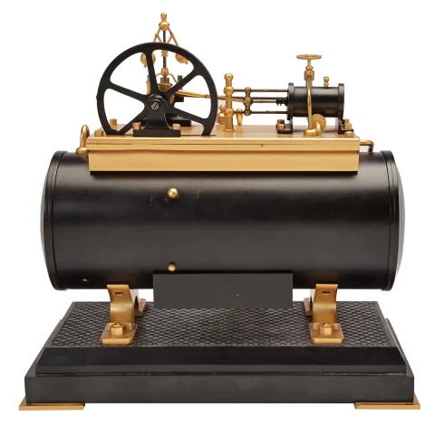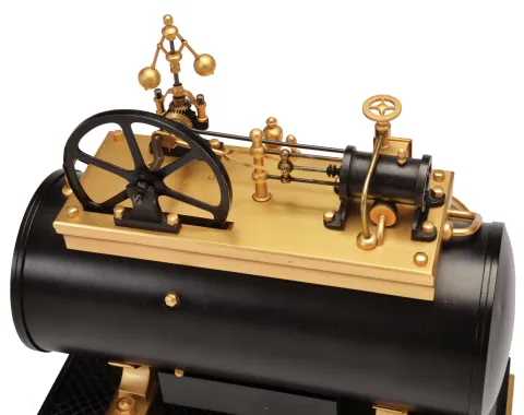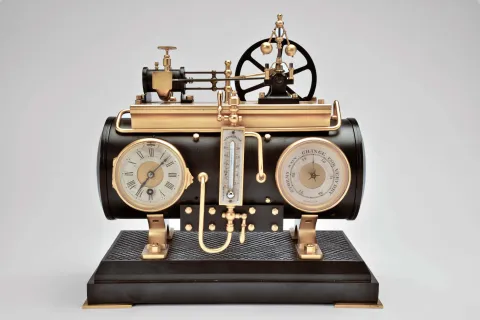 France, a rare, gilt and patinated, automated steam engine compendium, the horizontal boiler mounted to a cast floor with crosshatched surface, and resting on a black slate base, boiler fitted with an 8 day, timepiece and aneroid barometer, both with silvered dials and flanking the central thermometer with silvered scale, and surmounted by the engine flywheel, governor, cylinder and valve, the flywheel, piston, and governor powered by a movement concealed in the cylinder, the motion started and stopped through the screw in the cylinder valve, the valve front with plaque marked "D. H. Depose" restored finish, silvered dials and scale with minor toning, governor with minor bend, timepiece with replaced platform, needs encouragement to start, thermometer not working, barometer appears to be working, automation working, clockwork driving the motion runs erratically, speeds up and slows down, and sometimes refuses to run, will need service