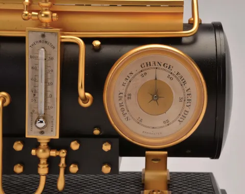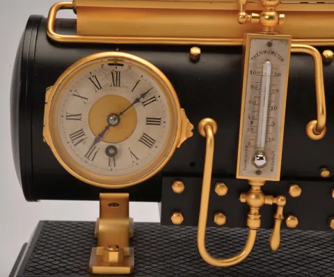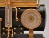 France, a rare, gilt and patinated, automated steam engine compendium, the horizontal boiler mounted to a cast floor with crosshatched surface, and resting on a black slate base, boiler fitted with an 8 day, timepiece and aneroid barometer, both with