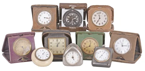 Desk and travel clocks- 10 (Ten), 30 hour and 8 day, Swiss and American, makers including Waltham, New Haven, Majestic, Junghans, and others, most with folding, leather bound cases, one desk clock with molded celluloid case and white enamel dial