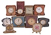 Desk and travel clocks- 10 (Ten), 30 hour and 8 day, Swiss and American, makers including Waltham, New Haven, Waterbury, Keinzle, Normis, and others, most with folding, leather bound cases, one desk clock with octagonal case, easel back, and pink mother