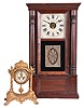 Clocks- 2 (Two): (1) Chauncey Jerome, New Haven, Conn., 8 day, time and strike, weight half column and cornice shelf clock, c1850 (2) William L. Gilbert Clock Co., Winsted, Conn., "Trinity", 8 day, time and strike, spring brass movement mantel clock,