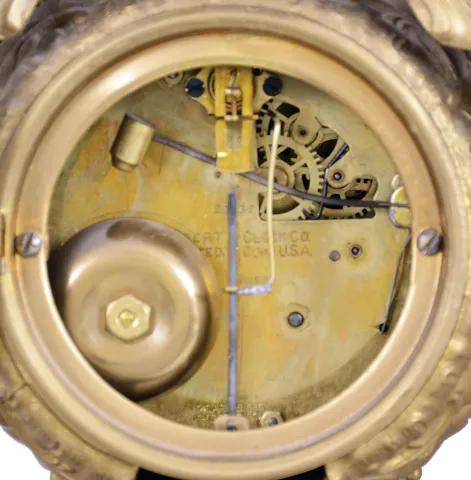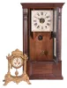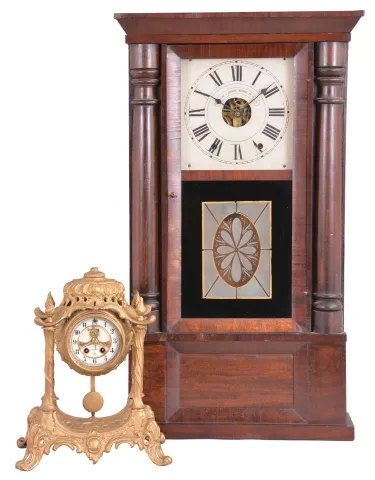 Clocks- 2 (Two): (1) Chauncey Jerome, New Haven, Conn., 8 day, time and strike, weight half column and cornice shelf clock, c1850 (2) William L. Gilbert Clock Co., Winsted, Conn., "Trinity", 8 day, time and strike, spring brass movement mantel clock, c1913 (1) Refinished mahogany veneered case in nice condition. Original dial has been restored by inpainting the loss areas and relining the numbers and signature. Original tablet. No label inside. (2) Cast spelter case is missing the top cast finial and case now gold painted. Original porcelain dial with automatic beat adjustment is perfect. Original hands. Pendulum is replaced. Movement is signed.