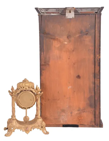 (1) Refinished mahogany veneered case in nice condition. Original dial has been restored by inpainting the loss areas and relining the numbers and signature. Original tablet. No label inside. (2) Cast spelter case is missing the top cast finial and case now gold painted. Original porcelain dial with automatic beat adjustment is perfect. Original hands. Pendulum is replaced. Movement is signed.