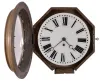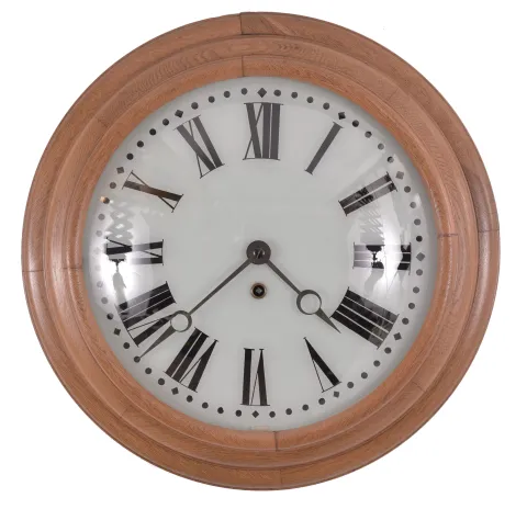 B.M. and C., France, gallery clock, 8 day, time only, spring driven movement with Brocot deadbeat escapement in a wood case with oak bezel, convex glass, back-painted glass dial with Roman numerals, and blued steel Breguet hands.