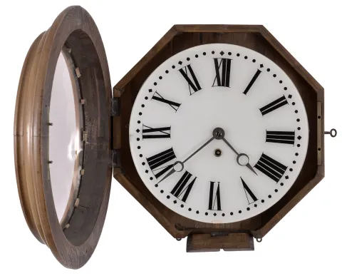 B.M. and C., France, gallery clock, 8 day, time only, spring driven movement with Brocot deadbeat escapement in a wood case with oak bezel, convex glass, back-painted glass dial with Roman numerals, and blued steel Breguet hands. The case bezel has been refinished. The backboard has two newer piece on either side that have been carefully glued to the older pieces. The square French movement is signed "B.M. & C." on the front plate. The serial number on the movement is the same as the on stamped in the pendulum ball. Brocot escapement located between the plates does escape. The backboard has three holes where the movement was once mounted. Steel door hinges seem a bit out of place. The large convex glass is in very good condition, remounted with small nails and cork at some point. The back-painted glass dial is very good.