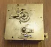 The case bezel has been refinished. The backboard has two newer piece on either side that have been carefully glued to the older pieces. The square French movement is signed "B.M. & C." on the front plate. The serial number on the movement is the same as the on stamped in the pendulum ball. Brocot escapement located between the plates does escape. The backboard has three holes where the movement was once mounted. Steel door hinges seem a bit out of place. The large convex glass is in very good condition, remounted with small nails and cork at some point. The back-painted glass dial is very good.