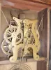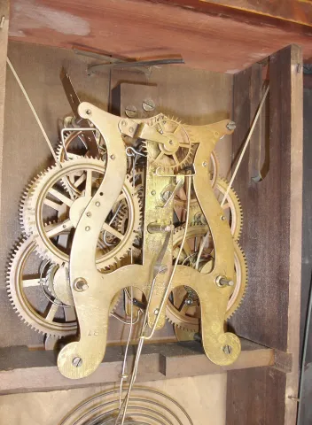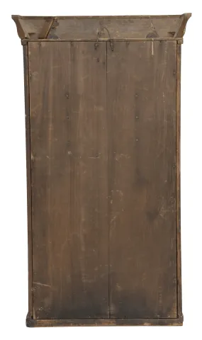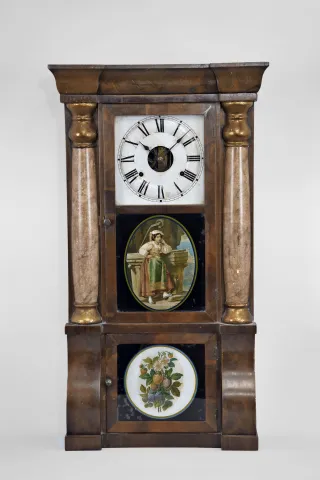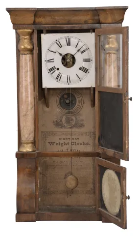 Mahogany veneered case in an old finish has some veneer loss on the base, and some loss on the cornice edge. Both tablets are original. Someone has attempted to regild the column tops and bases with copper leaf. Original painted dial has some small inpainted areas and repairs to the numbers. Clean label inside. Movement is signed.