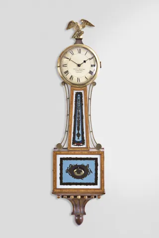 Unknown maker, modern copy of 8 day, weight brass movement patent or banjo wall timepiece. Mahogany banded case in original finish has a small damage at the hinge side member on the bottom door. The head is interesting in that it is made up laminated veneers. The dial has some light surface stains and an interesting signature of: "Biddle & Mumford, Clerkenwell, London", the apparent retailers.