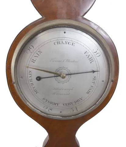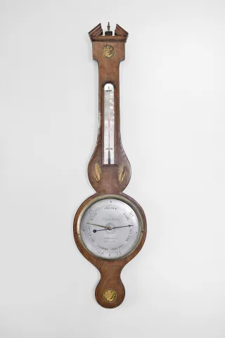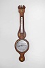 Vanini and Montini, Peterborough, England, wheel or banjo barometer with alcohol thermometer, in an inlaid mahogany veneered case with silvered dial and brass indicator knob.