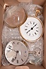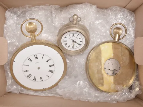 Two boxes of parts including five movements: 3 by Waltham, 1 by Elgin, and one that may be Swiss. Three are in oversize cases up to 7.5 inches in diameter. Two movement tick and the remainder tick and stop. An assortment of glass hemisphere are included which may not make for complete clocks. This lot appears to be a combination of old and new parts. These clocks are for parts or restoration and are sold "as is ".