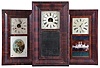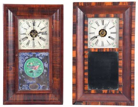 (1) Refinished mahogany veneered case has some veneer loss on the lower right side. Replaced dial. Original hands. Original tablet has scattered loss. Dark label inside; (2) Refinished rosewood veneered case has some loss on the outer band. Original painted dial is soiled with wear to the numbers. Replaced hands. Original tablet has minor loss. Clean label inside. (3) Refinished mahogany veneered case has a couple chips on the outer band and lower left side. Original painted dial has some paint loss. Replaced hands. Period mirror looks to be original. Stained label inside. (4) Refinished mahogany veneered case has some loss on the outer band. Original dial pan has a new paper dial. Original hands and mirror. Very dark label inside. (5) Mahogany veneered case in an old finish has a couple chips on the outer band. Original painted dial has some wear at the winding arbors. Original hands and tablet with some loss. Clean label inside. (6) Rosewood veneered case in original finish has some loss on the outer band and the door. Original painted dial has a couple small spots of paint loss. Original hands and mirror. (7) Refinished mahogany and zebra wood veneered case has some loss on the outer band. Original painted dial has minor loss at the mounting pins. Original hands and mirror. Clean label inside. (8) Mahogany and rosewood veneered case in an old finish has minor loss on the outer band. Original painted dial has scattered loss. Replaced hands. Original tablet has background loss. Dark label inside.