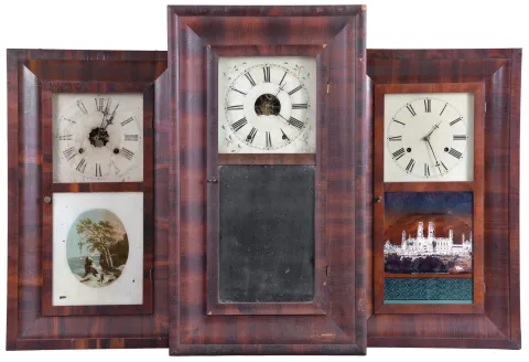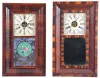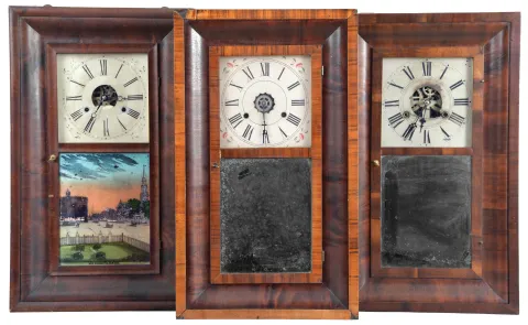 Clocks- 8 (Eight): (1) Forestville Manufacturing Co., Forestville, Conn., 30 hour, time and strike, weight brass movement OG shelf clock, c1850; (2) Ansonia Brass & Copper Co., Ansonia, Conn., 30 hour, time and strike, weight brass movement OG shelf clock, c1870 (3) George Marsh, Winchester, Conn., 30 hour, time and strike, weight brass movement OG shelf clock, c1850 (4) Forestville Clock Co., Forestville, Conn., 30 hour, time, strike and alarm weight brass movement OG shelf clock, c1850 (5) E. & A. Ingraham & Co., Bristol, Conn., 30 hour, time and strike, weight brass movement OG shelf clock, c1852 (6) M. W. Atkins & Co., Bristol, Conn., 8 day, time and strike, weight brass movement OOG shelf clock, c1850 (7) Forestville Clock Co., Forestville, Conn., 30 hour, time, strike and alarm weight brass movement OG shelf clock, c1850 (8) William L. Gilbert Clock Co., Winsted, Conn., 30 hour, time and strike, weight brass movement OG shelf clock, c1870 (1) Refinished mahogany veneered case has some veneer loss on the lower right side. Replaced dial. Original hands. Original tablet has scattered loss. Dark label inside; (2) Refinished rosewood veneered case has some loss on the outer band. Original painted dial is soiled with wear to the numbers. Replaced hands. Original tablet has minor loss. Clean label inside. (3) Refinished mahogany veneered case has a couple chips on the outer band and lower left side. Original painted dial has some paint loss. Replaced hands. Period mirror looks to be original. Stained label inside. (4) Refinished mahogany veneered case has some loss on the outer band. Original dial pan has a new paper dial. Original hands and mirror. Very dark label inside. (5) Mahogany veneered case in an old finish has a couple chips on the outer band. Original painted dial has some wear at the winding arbors. Original hands and tablet with some loss. Clean label inside. (6) Rosewood veneered case in original finish has some loss on the outer band and the door. Original painted dial has a couple small spots of paint loss. Original hands and mirror. (7) Refinished mahogany and zebra wood veneered case has some loss on the outer band. Original painted dial has minor loss at the mounting pins. Original hands and mirror. Clean label inside. (8) Mahogany and rosewood veneered case in an old finish has minor loss on the outer band. Original painted dial has scattered loss. Replaced hands. Original tablet has background loss. Dark label inside.
