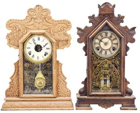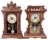 Clocks- 4 (Four): (1) Seth Thomas Clock Co., Thomaston, Conn., "College New York" shelf clock with a spring driven, 8 day, time and half hour strike movement in a walnut case, c1898; (2) E. N. Welch Mfg. Co., Forestville, Conn., "Donita" shelf clock with