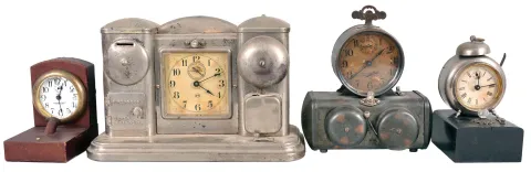 Clocks- 5 (Five) Illuminated Clocks: unusual spring-driven clocks illuminated by small flashlight bulbs. Models include Darche Mfg. Co., Chicago, IL, "Flashlight" and "Searchlight" alarm novelty clocks, Jansen "Nitelite" as well as models by Waterbury and