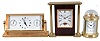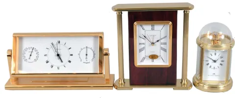 Clocks- 3 (Three) Fancy Modern Desk: (1) Mathew Norman, Switzerland, carriage clock, 8 day, time only, spring driven movement with visible balance wheel movement in a highly polished brass case with beveled glass sides and dome top; (2) Chelsea Clock Co., Boston, quartz clock with thermometer and hygrometer in polished brass case; (3) Linden, North Smithfield, RI, quartz table clock in a wood and metal case. High quality modern clocks in excellent condition. The Norman and Linden are in their original packaging. The Chelsea comes in a branded felt bag. The Norman ticks briskly when wound, showcasing the visible balance wheel escapement. The Chelsea will need a new, specialized battery. Sold "as is ".