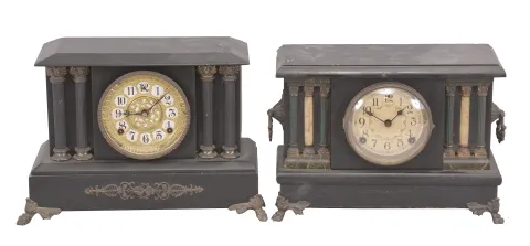 Clocks- 4 (Four): (1) Wm. L. Gilbert, "Palisade" mantel clock, 8 day, time and strike, spring driven movement in a black enameled case, c1904; (2) Unmarked, but Sessions black mantle clock, 8 day, time and strike, spring driven movement in a black wood case, c1920; (3) Sessions Clock Co., "Baldwin" mantel clock, 8 day, time and strike, spring driven movement in black enameled case, c1923 (4) Seth Thomas Clock Co., mantel clock, 8 day, time and strike, spring driven movement in an Adamantine case, c1910. clocks in generally good condition. Most are dusty and probably need mechanical attention. Dimensions are for the "Baldwin ".
