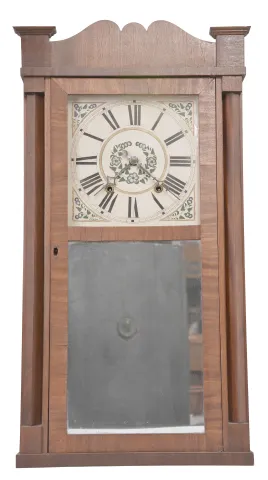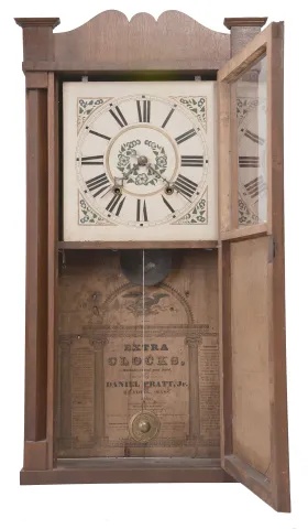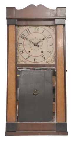 Clocks- 2 (Two): (1) E. & G. Bartholemew, Bristol, Conn., 30 hour, time and strike weight wood movement pilaster and splat shelf clock. c1832 (2) Daniel Pratt, Jr., Reading Mass., 30 hour, time and strike weight wood movement corner columns and splat shelf clock. c1839 (1) Mahogany and birds eye case in an old finish has veneer loss on the base, repairs on the two chimneys and some loss near the cross strip. Mirror is a replacement. Alarm dial is in poor condition and is most likely original to the clock as there is evidence that an alarm bell was behind the splat. The current movement does not have an alarm. Period hands. Top glass is missing. Dark label inside. (2) Refinished mahogany veneered case has couple repairs on the door and cross strip. Original dial is in very nice condition. Original hands and mirror. Clean label inside.